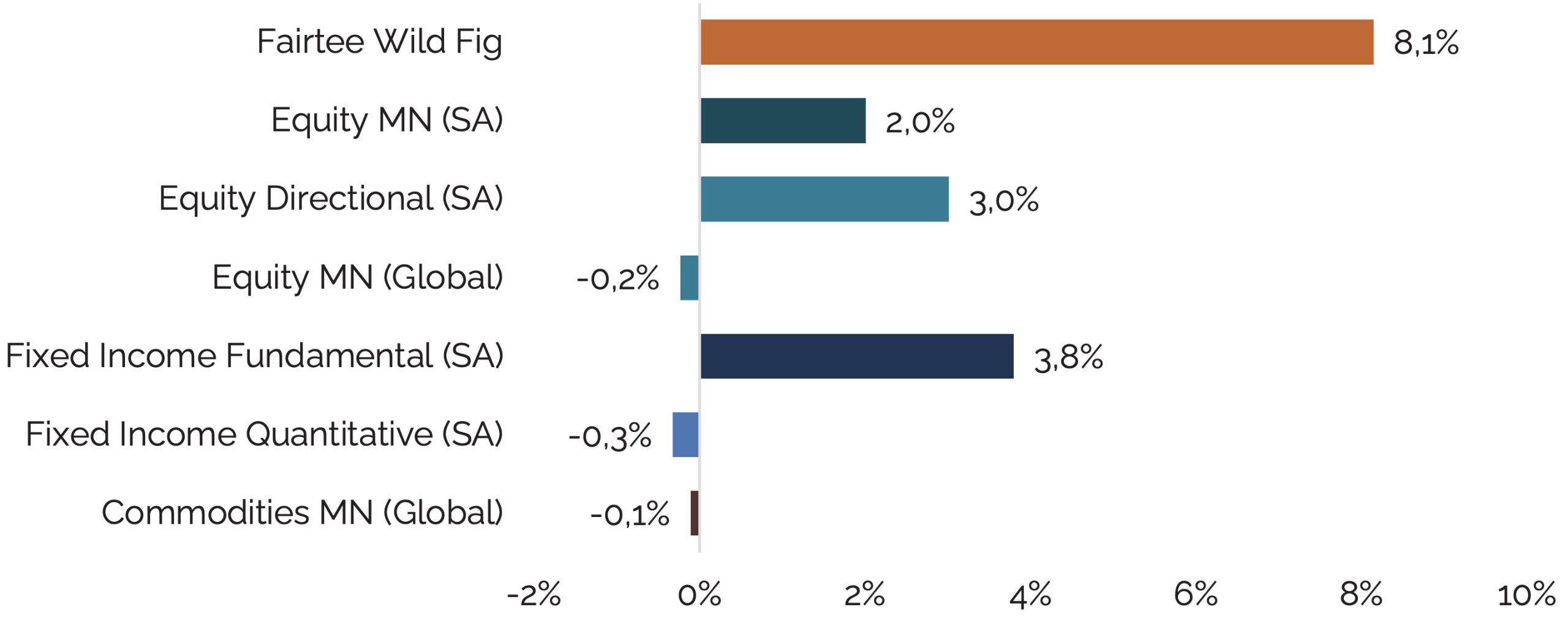 Equity strategies were cumulatively the largest contributor to Fund performance, contributing (+4.8%) to the Fund during the quarter. Positioning in our South African directional long/short and market-neutral strategies delivered positive returns, while global market-neutral strategies marginally detracted. Positive attribution was primarily driven by sector positioning in financials, materials and healthcare, with consumer discretionary and general retailers detracting.