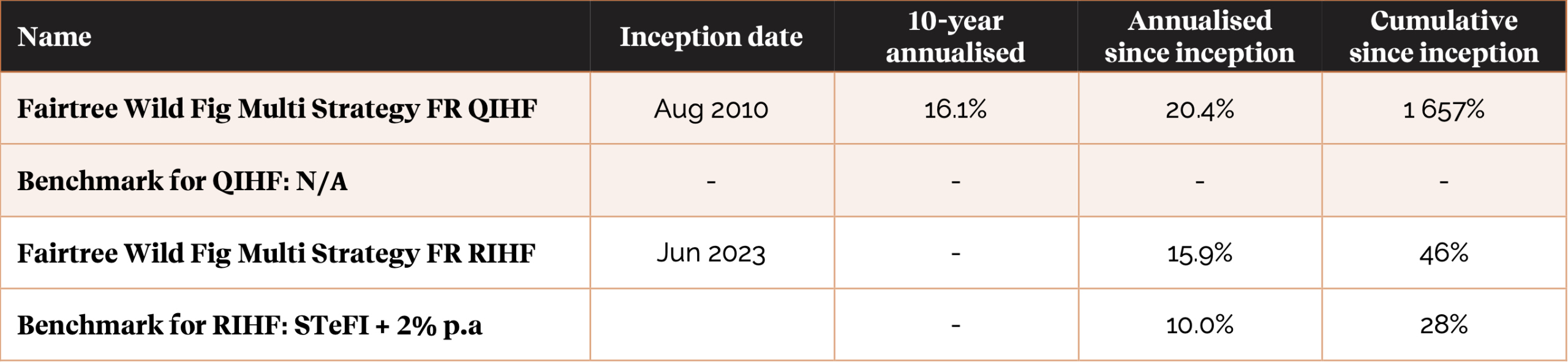 *Note: Reported fund performance throughout refers to the Fairtree Wild Fig Multi Strategy FR RIHF (unless otherwise stated). All returns are net of all fees. As the funds are managed in a similar manner, despite the regulatory differences between the two ZAR funds (QIHF and RIHF), over the fullness of time, we expect that the two funds will produce similar net returns. US dollar investors can access the strategy via the Cayman-domiciled Fairtree Wild Fig Multi-Strategy USD fund.